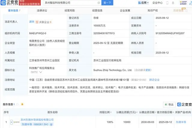 企查查APP显示,近日,苏州智启科技有限公司成立,注册资本1亿元,经营范围包含:电子元器件批发;电子产品销售;信息技术咨询服务;网络与信息安全软件开发等。企查查股权穿透显示,该公司由东微半导(688261)全资持股。