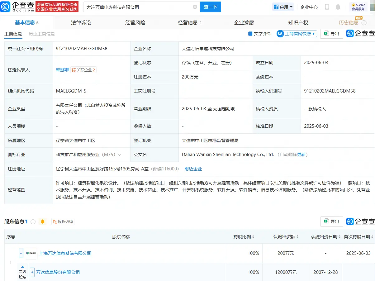 企查查APP显示,近日,大连万信申连科技有限公司成立,法定代表人为韩娜娜,注册资本为200万元,经营范围包含:建筑智能化系统设计;计算机系统服务;软件开发;软件销售;信息技术咨询服务等。企查查股权穿透显示,该公司由万达信息(300168)间接全资持股。
